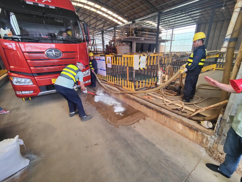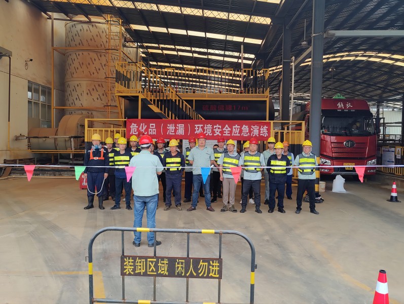 演練場景:2024年6月5日14:00,外協單位到我司裝廢酸,由于打酸泵皮圈老化,導致廢酸泄漏,崗位班組?張士輝巡檢過程中發現打酸泵漏酸,并使用對講機呼叫副指揮戴永華發生危險品泄漏,副指揮接到通知立即上報給總指揮單曉亮,總指揮單曉亮立即啟動危險廢物泄漏專項應急預案,應急救援小組楊守錄、丁德懿立即趕赴現場,啟動危險品泄漏專項應急預案,安排單振東、張士輝對泄漏的液體用石灰進行覆蓋,待緩釋后進行清掃、收集,由設備搶修組鄧志平、嵇禮忠對打酸泵的皮圈進行更換,人員疏散完畢各部?負責人清點人數。事后由張士輝做好環境監測和現場泄漏物清理收集無害化處理。最后由總指揮對此次演練進行點評。